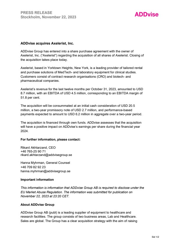 ADDvise Group AB (publ) is a leading supplier of equipment to healthcare and research facilities. The group consists of two business areas, Lab and Healthcare. Sales are global. The Group has a clear acquisition strategy with the aim of raising shareholder value and expand the business – both geographically and product wise. ADDvise Group’s shares are listed on Nasdaq First North Premier Growth Market and Mangold Fondkommission AB is the Company’s Certified Adviser. Additional information is available at www.addvisegroup.com.