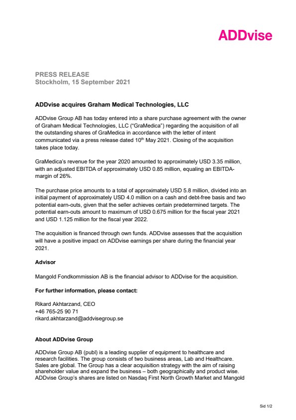 ADDvise Group AB has today entered into a share purchase agreement with the owner of Graham Medical Technologies, LLC (“GraMedica”) regarding the acquisition of all the outstanding shares of GraMedica in accordance with the letter of intent communicated via a press release dated 10th May 2021. Closing of the acquisition takes place today.