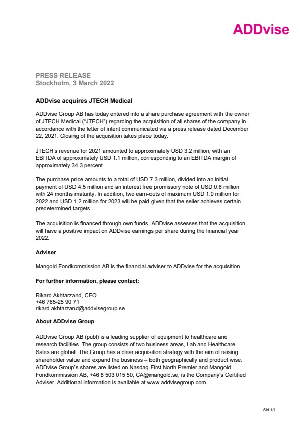 ADDvise Group AB has today entered into a share purchase agreement with the owner of JTECH Medical (“JTECH”) regarding the acquisition of all shares of the company in accordance with the letter of intent communicated via a press release dated December 22, 2021. Closing of the acquisition takes place today.