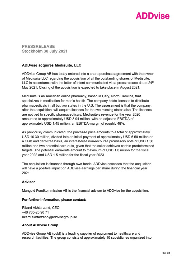 ADDvise Group AB has today entered into a share purchase agreement with the owner of Medisuite LLC regarding the acquisition of all the outstanding shares of Medisuite, LLC in accordance with the letter of intent communicated via a press release dated 24th May 2021. Closing of the acquisition is expected to take place in August 2021.