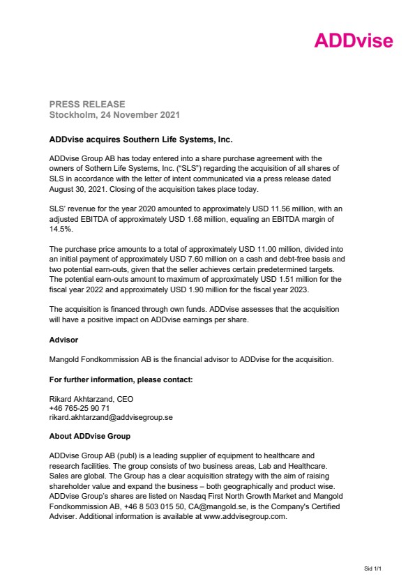 ADDvise Group AB has today entered into a share purchase agreement with the owners of Sothern Life Systems, Inc. (“SLS”) regarding the acquisition of all shares of SLS in accordance with the letter of intent communicated via a press release dated August 30, 2021. Closing of the acquisition takes place today.