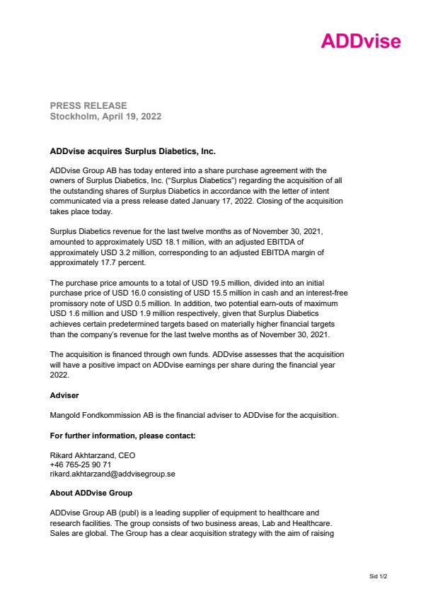 ADDvise Group AB has today entered into a share purchase agreement with the owners of Surplus Diabetics, Inc. (“Surplus Diabetics”) regarding the acquisition of all the outstanding shares of Surplus Diabetics in accordance with the letter of intent communicated via a press release dated January 17, 2022. Closing of the acquisition takes place today.