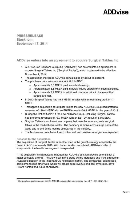 In the event that Surgical Tables had been consolidated in January 1, 2013 and combined with the acquisition that ADDvise conducted in 2013, ADDvise would have had a proforma turnover of 139,4 MSEK and had an EBITDA result of 6,3 MSEK for the fiscal year 2013. Under the same conditions, the ADDvise Group would have had 78,7 MSEK in revenues with an EBITDA of 5,9 million for the first half of 2014.