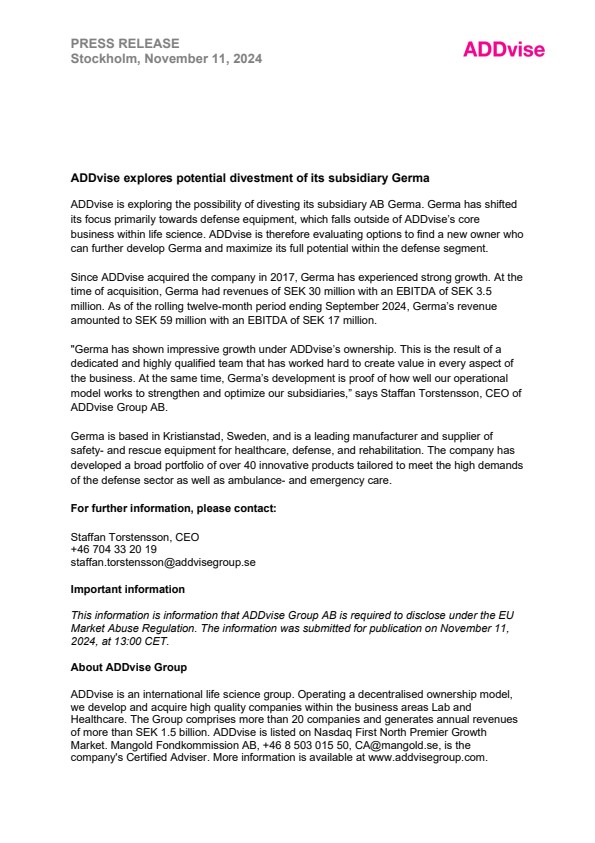 ADDvise is exploring the possibility of divesting its subsidiary AB Germa. Germa has shifted its focus primarily towards defense equipment, which falls outside of ADDvise’s core business within life science. ADDvise is therefore evaluating options to find a new owner who can further develop Germa and maximize its full potential within the defense segment.