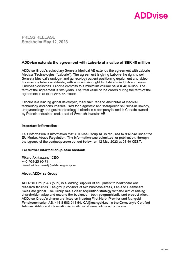 ADDvise Group’s subsidiary Sonesta Medical AB extends the agreement with Laborie Medical Technologies (“Laborie”). The agreement is giving Laborie the right to sell Sonesta Medical’s urology- and gynecology patient positioning equipment and video fluoroscopy tables worldwide, with an exclusive right to distribute in USA and some European countries. Laborie commits to a minimum volume of SEK 48 million. The term of the agreement is two years. The total value of the orders during the term of the agreement is at least SEK 48 million.