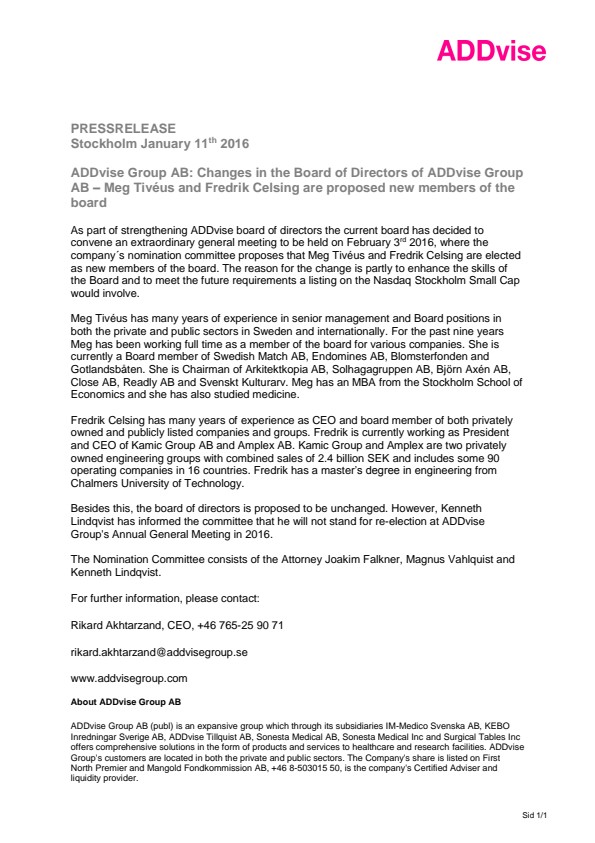 ADDvise Group AB: Changes in the Board of Directors of ADDvise Group AB – Meg Tivéus and Fredrik Celsing are proposed new members of the board