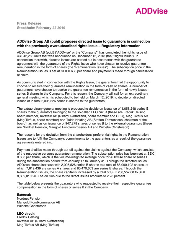 ADDvise Group AB (publ) (“ADDvise” or the “Company”) has completed the rights issue of 43,042,288 units that was announced on December 12, 2018 (the “Rights Issue”). In connection therewith, directed issues are carried out in accordance with the guarantee agreement with the guarantors of the Rights Issue who have chosen to receive guarantee remuneration in the form of shares (the “Remuneration Issues”). The subscription price in the Remuneration Issues is set at SEK 0.638 per share and payment is made through cancellation of claim.