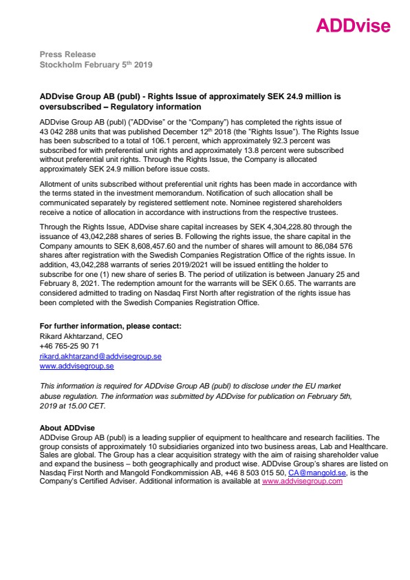 ADDvise Group AB (publ) (”ADDvise” or the “Company”) has completed the rights issue of 43 042 288 units that was published December 12th2018 (the ”Rights Issue”). The Rights Issue has been subscribed to a total of 106.1 percent, which approximately 92.3 percent was subscribed for with preferential unit rights and approximately 13.8 percent were subscribed without preferential unit rights. Through the Rights Issue, the Company is allocated approximately SEK 24.9 million before issue costs.