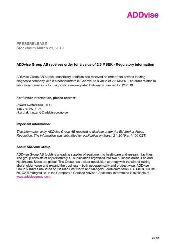 ADDvise Group AB´s (publ) subsidiary LabRum has received an order from a world leading diagnostic company with it´s headquarters in Geneva, to a value of 2,5 MSEK. The order relates to laboratory furnishings for diagnostic sampling labs. Delivery is planned to Q2 2019.