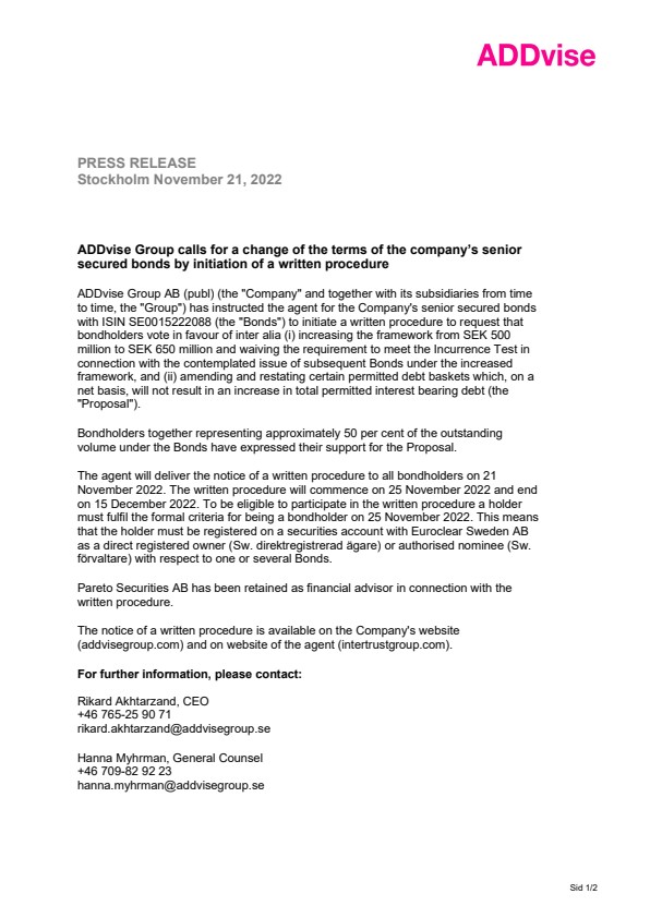 ADDvise Group AB (publ) (the “Company” and together with its subsidiaries from time to time, the “Group”) has instructed the agent for the Company’s senior secured bonds with ISIN SE0015222088 (the “Bonds”) to initiate a written procedure to request that bondholders vote in favour of inter alia (i) increasing the framework from SEK 500 million to SEK 650 million and waiving the requirement to meet the Incurrence Test in connection with the contemplated issue of subsequent Bonds under the increased framework, and (ii) amending and restating certain permitted debt baskets which, on a net basis, will not result in an increase in total permitted interest bearing debt (the “Proposal”).