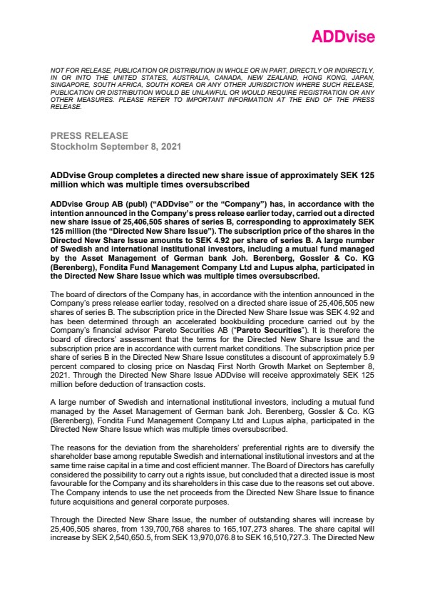 The board of directors of the Company has, in accordance with the intention announced in the Company’s press release earlier today, resolved on a directed share issue of 25,406,505 new shares of series B. The subscription price in the Directed New Share Issue was SEK 4.92 and has been determined through an accelerated bookbuilding procedure carried out by the Company’s financial advisor Pareto Securities AB (“Pareto Securities”). It is therefore the board of directors’ assessment that the terms for the Directed New Share Issue and the subscription price are in accordance with current market conditions. The subscription price per share of series B in the Directed New Share Issue constitutes a discount of approximately 5.9 percent compared to closing price on Nasdaq First North Growth Market on September 8, 2021. Through the Directed New Share Issue ADDvise will receive approximately SEK 125 million before deduction of transaction costs.