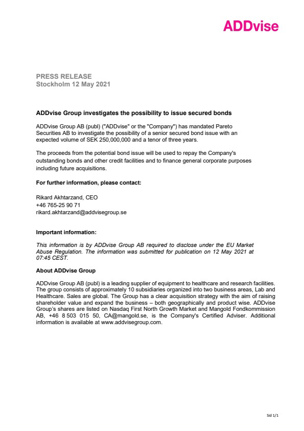 ADDvise Group AB (publ) (“ADDvise” or the “Company”) has mandated Pareto Securities AB to investigate the possibility of a senior secured bond issue with an expected volume of SEK 250,000,000 and a tenor of three years.