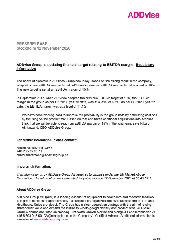 This information is by ADDvise Group AB required to disclose under the EU Market Abuse Regulation. The information was submitted for publication on 12 November 2020 at 08:45 CET.