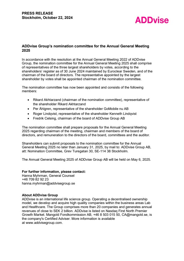 Shareholders can submit proposals to the nomination committee for the Annual General Meeting 2025 no later than January 31, 2025, by mail to: ADDvise Group AB, att: Nomination Committee, Grev Turegatan 30, SE-114 38 Stockholm.