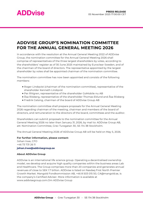 Shareholders can submit proposals to the nomination committee for the Annual General Meeting 2026 no later than January 31, 2026, by mail to: ADDvise Group AB, att: Nomination Committee, Grev Turegatan 30, SE-114 38 Stockholm.