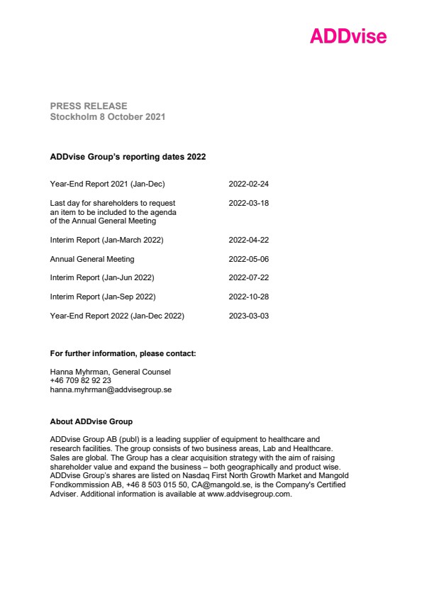 ADDvise Group AB (publ) is a leading supplier of equipment to healthcare and research facilities. The group consists of two business areas, Lab and Healthcare. Sales are global. The Group has a clear acquisition strategy with the aim of raising shareholder value and expand the business – both geographically and product wise. ADDvise Group’s shares are listed on Nasdaq First North Growth Market and Mangold Fondkommission AB, +46 8 503 015 50, CA@mangold.se, is the Company’s Certified Adviser. Additional information is available at www.addvisegroup.com.