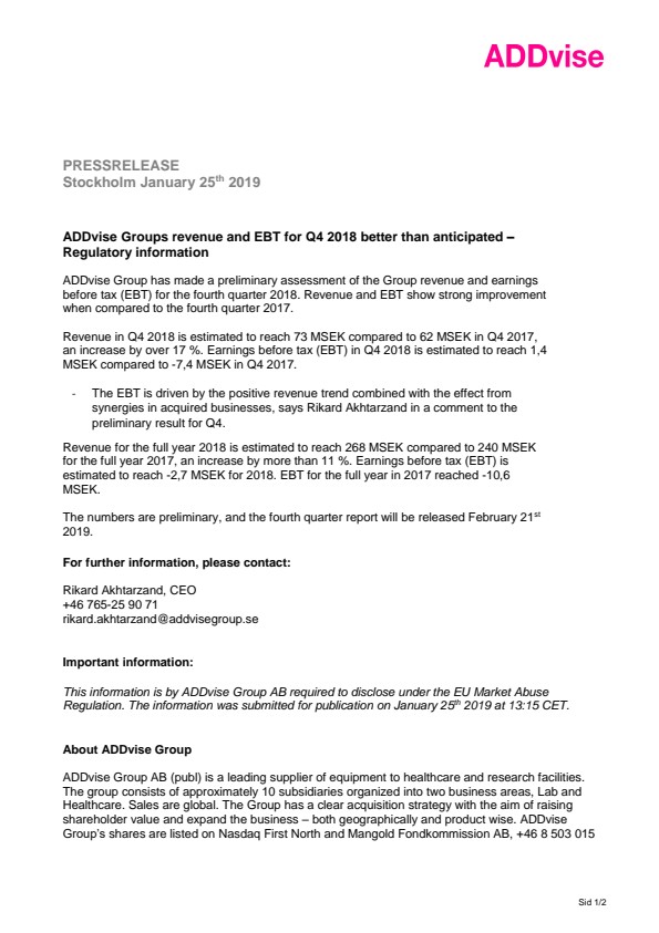 This information is by ADDvise Group AB required to disclose under the EU Market Abuse Regulation. The information was submitted for publication on January 25th 2019 at 13:15 CET.