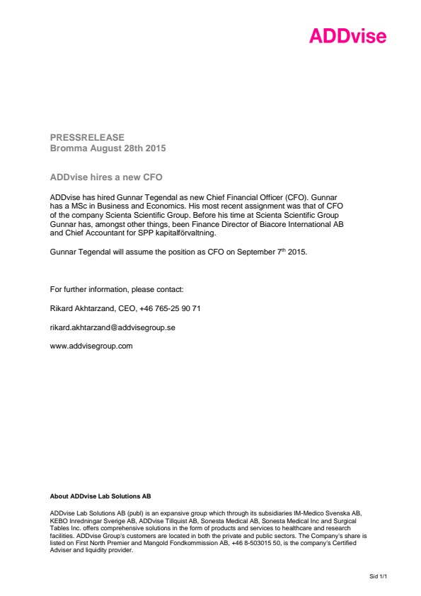 ADDvise Lab Solutions AB (publ) is an expansive group which through its subsidiaries IM-Medico Svenska AB, KEBO Inredningar Sverige AB, ADDvise Tillquist AB, Sonesta Medical AB, Sonesta Medical Inc and Surgical Tables Inc. offers comprehensive solutions in the form of products and services to healthcare and research facilities. ADDvise Group’s customers are located in both the private and public sectors. The Company’s share is listed on First North Premier and Mangold Fondkommission AB, +46 8-503015 50, is the company’s Certified Adviser and liquidity provider.
