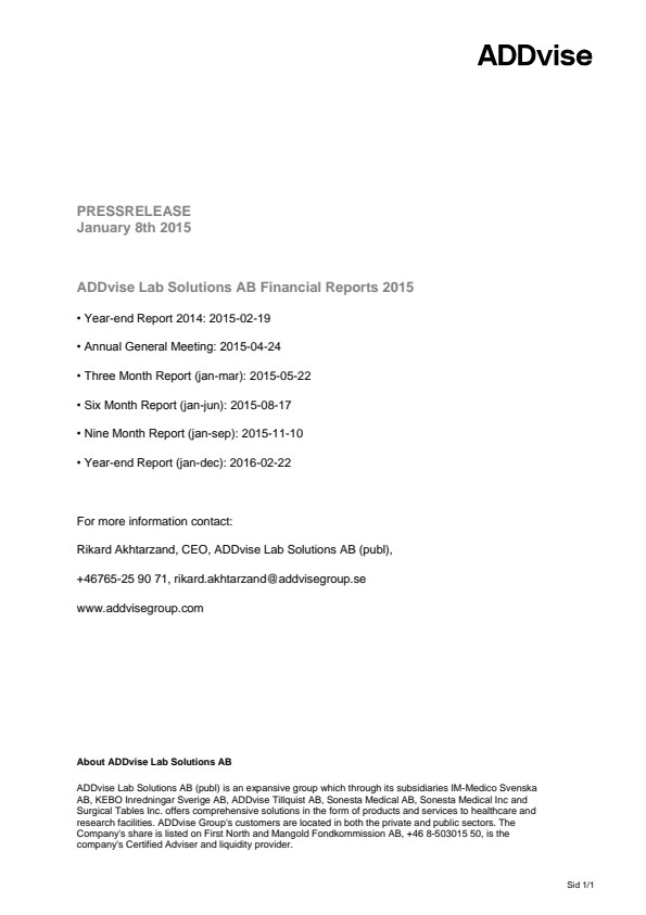 ADDvise Lab Solutions AB (publ) is an expansive group which through its subsidiaries IM-Medico Svenska AB, KEBO Inredningar Sverige AB, ADDvise Tillquist AB, Sonesta Medical AB, Sonesta Medical Inc and Surgical Tables Inc. offers comprehensive solutions in the form of products and services to healthcare and research facilities. ADDvise Group’s customers are located in both the private and public sectors. The Company’s share is listed on First North and Mangold Fondkommission AB, +46 8-503015 50, is the company’s Certified Adviser and liquidity provider.