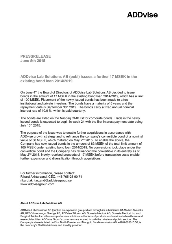 The purpose of the issue was to enable further acquisitions in accordance with ADDvise growth strategy and to refinance the company’s convertible bond of a nominal value of 30 MSEK, which matured on May 2nd 2015. To enable the above, the Company has now issued bonds in the amount of 83 MSEK of the total limit amount of 100 MSEK under existing bond loan 2014/2019. No conversions took place under the convertible bond and the Company has refinanced the convertible in its entirety as of May 2nd 2015. Newly received proceeds of 17 MSEK before transaction costs enable further expansion and diversification through acquisitions.