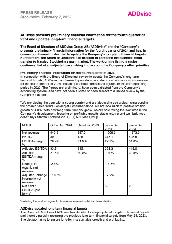 In connection with the Board of Directors’ review to update the Company’s long-term financial targets, ADDvise has chosen to provide an update on certain financial information for the fourth quarter of 2024, including financial comparison figures for the corresponding period in 2023. The figures are preliminary, have been extracted from the Company’s accounting system, and have not been audited or been subject to a limited review by the Company’s auditor.