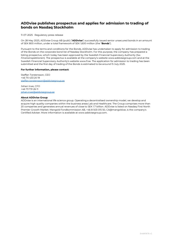 Pursuant to the terms and conditions for the Bonds, ADDvise has undertaken to apply for admission to trading of the Bonds on the corporate bond list of Nasdaq Stockholm. For this purpose, the company has prepared a listing prospectus, which today has been approved by the Swedish Financial Supervisory Authority (Sw. Finansinspektionen). The prospectus is available at the company’s website www.addvisegroup.com and at the Swedish Financial Supervisory Authority’s website www.fi.se. The application for admission to trading has been submitted and the first day of trading of the Bonds is estimated to be around 15 July 2025.