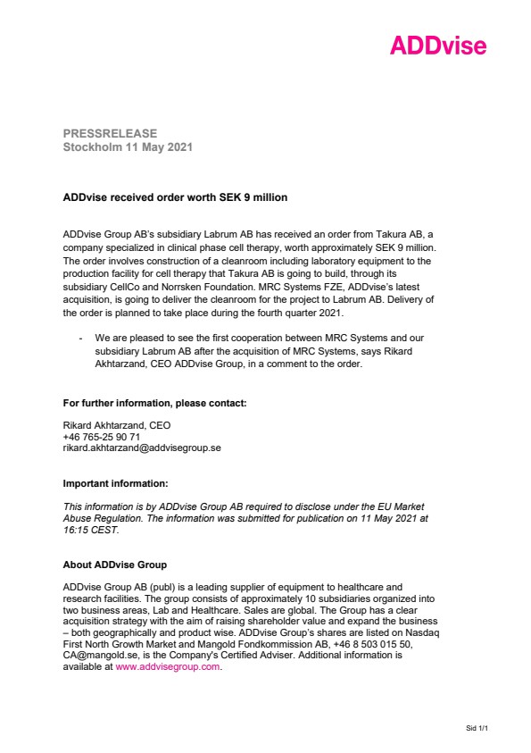 ADDvise Group AB’s subsidiary Labrum AB has received an order from Takura AB, a company specialized in clinical phase cell therapy, worth approximately SEK 9 million. The order involves construction of a cleanroom including laboratory equipment to the production facility for cell therapy that Takura AB is going to build, through its subsidiary CellCo and Norrsken Foundation. MRC Systems FZE, ADDvise’s latest acquisition, is going to deliver the cleanroom for the project to Labrum AB. Delivery of the order is planned to take place during the fourth quarter 2021.