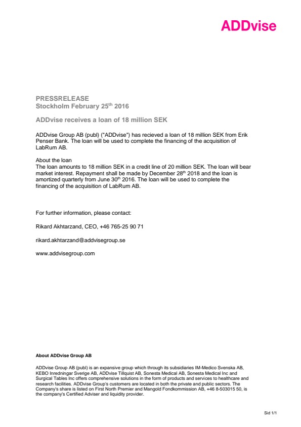 About the loan The loan amounts to 18 million SEK in a credit line of 20 million SEK. The loan will bear market interest. Repayment shall be made by December 28th 2018 and the loan is amortized quarterly from June 30th 2016. The loan will be used to complete the financing of the acquisition of LabRum AB.