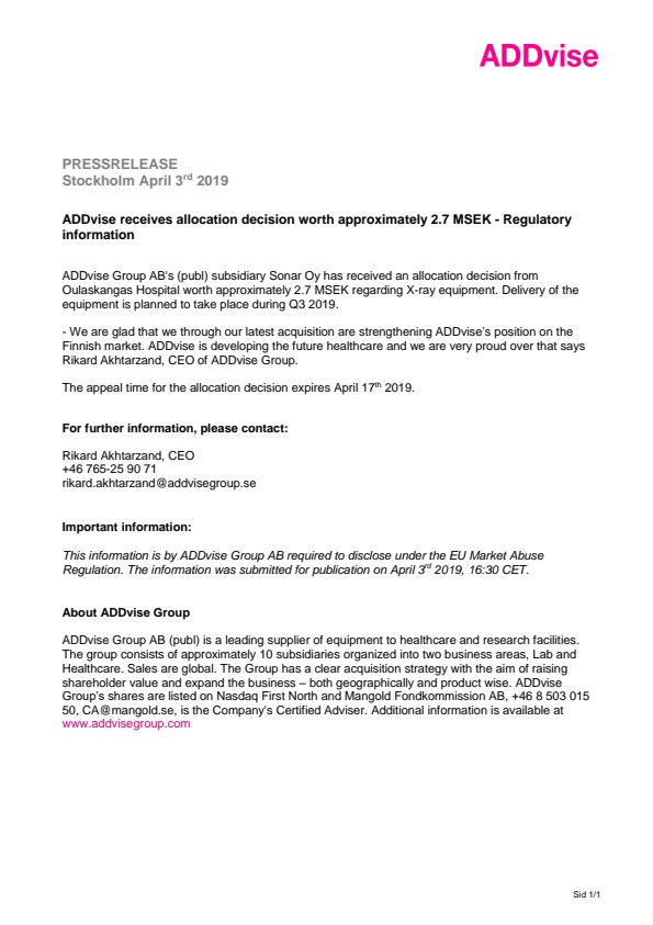 ADDvise Group AB’s (publ) subsidiary Sonar Oy has received an allocation decision from Oulaskangas Hospital worth approximately 2.7 MSEK regarding X-ray equipment. Delivery of the equipment is planned to take place during Q3 2019.