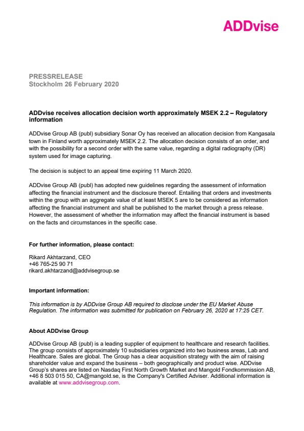 ADDvise Group AB (publ) subsidiary Sonar Oy has received an allocation decision from Kangasala town in Finland worth approximately MSEK 2.2. The allocation decision consists of an order, and with the possibility for a second order with the same value, regarding a digital radiography (DR) system used for image capturing.
