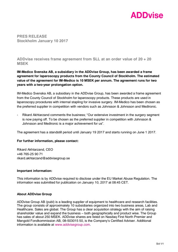 IM-Medico Svenska AB, a subsidiary in the ADDvise Group, has been awarded a frame agreement for laparoscopy products from the County Council of Stockholm. The estimated value of the agreement for IM-Medico is 10 MSEK per annum. The agreement runs for two years with a two-year prolongation option.