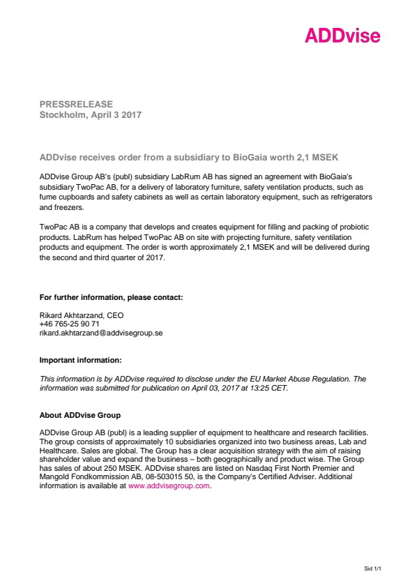 ADDvise Group AB’s (publ) subsidiary LabRum AB has signed an agreement with BioGaia’s subsidiary TwoPac AB, for a delivery of laboratory furniture, safety ventilation products, such as fume cupboards and safety cabinets as well as certain laboratory equipment, such as refrigerators and freezers.