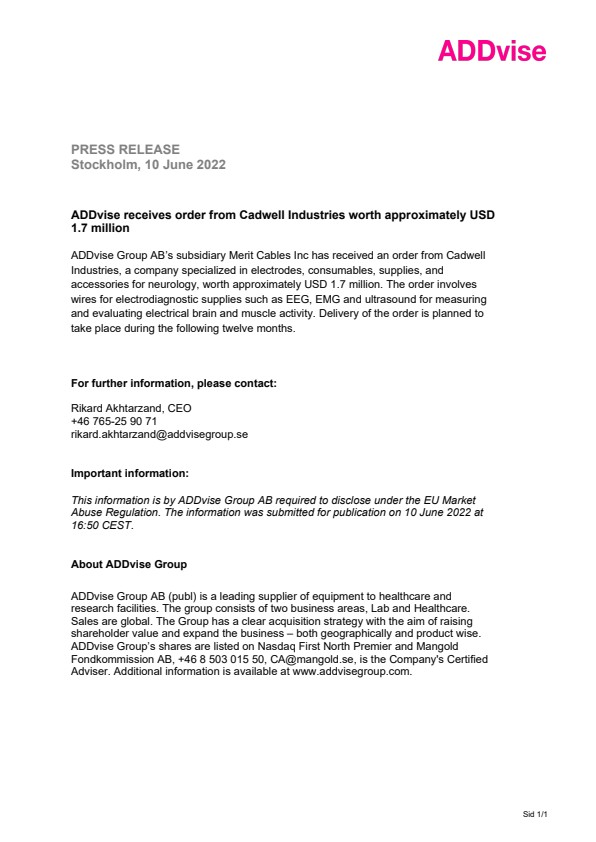 ADDvise Group AB’s subsidiary Merit Cables Inc has received an order from Cadwell Industries, a company specialized in electrodes, consumables, supplies, and accessories for neurology, worth approximately USD 1.7 million. The order involves wires for electrodiagnostic supplies such as EEG, EMG and ultrasound for measuring and evaluating electrical brain and muscle activity. Delivery of the order is planned to take place during the following twelve months.