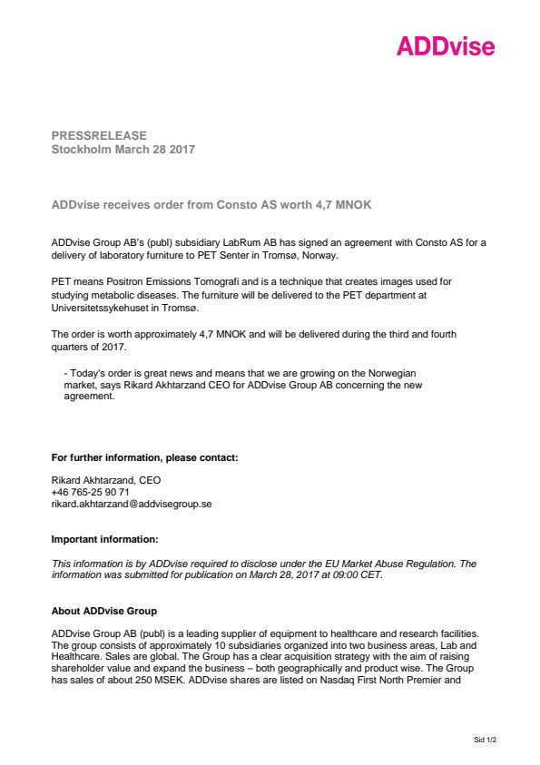 ADDvise Group AB’s (publ) subsidiary LabRum AB has signed an agreement with Consto AS for a delivery of laboratory furniture to PET Senter in Tromsø, Norway.