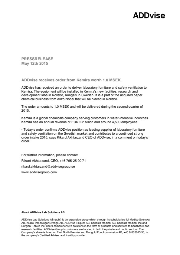 – Today’s order confirms ADDvise position as leading supplier of laboratory furniture and safety ventilation on the Swedish market and contributes to a continued strong order intake 2015, says Rikard Akhtarzand CEO of ADDvise, in a comment on today’s order.
