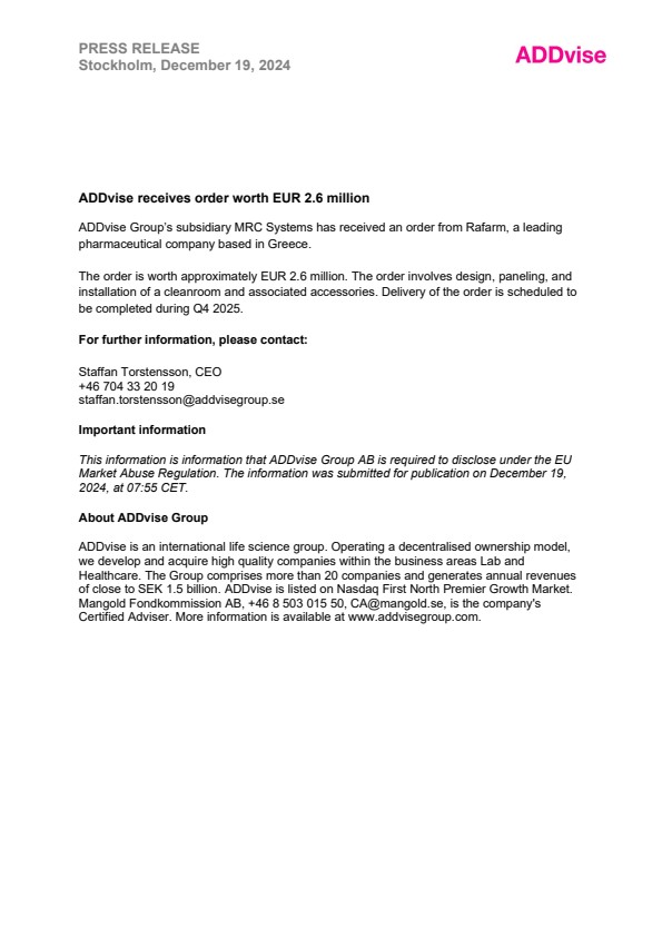 This information is information that ADDvise Group AB is required to disclose under the EU Market Abuse Regulation. The information was submitted for publication on December 19, 2024, at 07:55 CET.