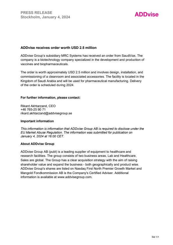 ADDvise Group’s subsidiary MRC Systems has received an order from SaudiVax. The company is a biotechnology company specialized in the development and production of vaccines and biopharmaceuticals.