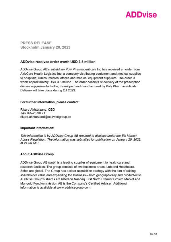 ADDvise Group AB’s subsidiary Poly Pharmaceuticals Inc has received an order from AxisCare Health Logistics Inc, a company distributing equipment and medical supplies to hospitals, clinics, medical offices and medical equipment suppliers. The order is worth approximately USD 3.5 million. The order consists of delivery of the prescription dietary supplemental Folite, developed and manufactured by Poly Pharmaceuticals. Delivery will take place during Q1 2023.