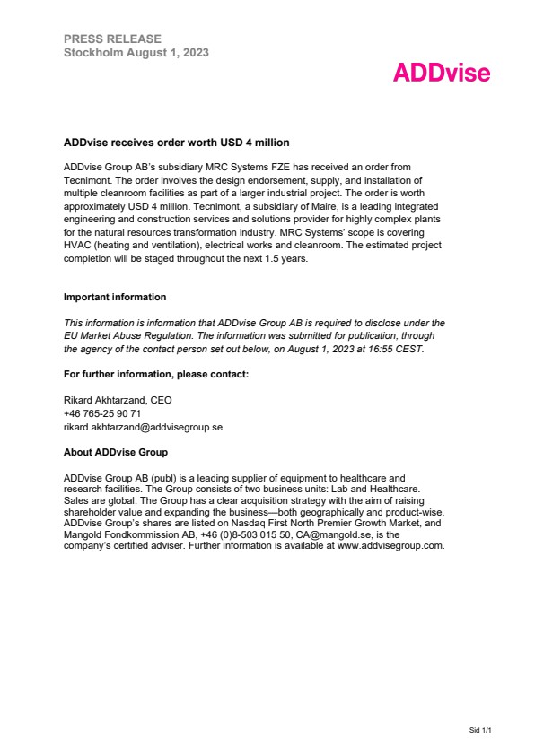 ADDvise Group AB’s subsidiary MRC Systems FZE has received an order from Tecnimont. The order involves the design endorsement, supply, and installation of multiple cleanroom facilities as part of a larger industrial project. The order is worth approximately USD 4 million. Tecnimont, a subsidiary of Maire, is a leading integrated engineering and construction services and solutions provider for highly complex plants for the natural resources transformation industry. MRC Systems’ scope is covering HVAC (heating and ventilation), electrical works and cleanroom. The estimated project completion will be staged throughout the next 1.5 years.