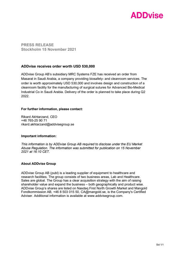 ADDvise Group AB’s subsidiary MRC Systems FZE has received an order from Masarat in Saudi Arabia, a company providing biosafety- and cleanroom services. The order is worth approximately USD 530,000 and involves design and construction of a cleanroom facility for the manufacturing of surgical sutures for Advanced Bio-Medical Industrial Co in Saudi Arabia. Delivery of the order is planned to take place during Q2 2022.