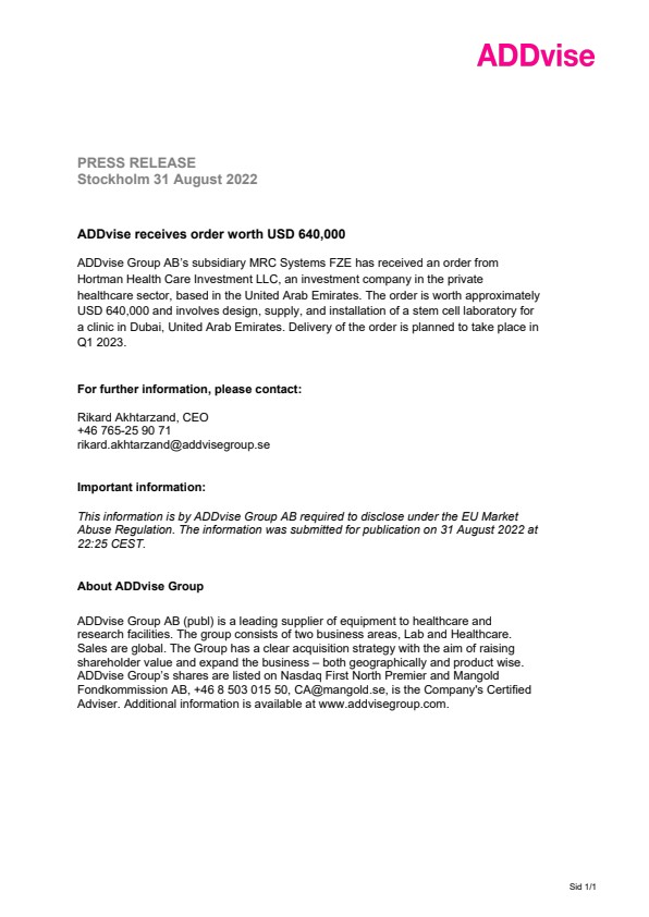 This information is by ADDvise Group AB required to disclose under the EU Market Abuse Regulation. The information was submitted for publication on 31 August 2022 at 22:25 CEST.