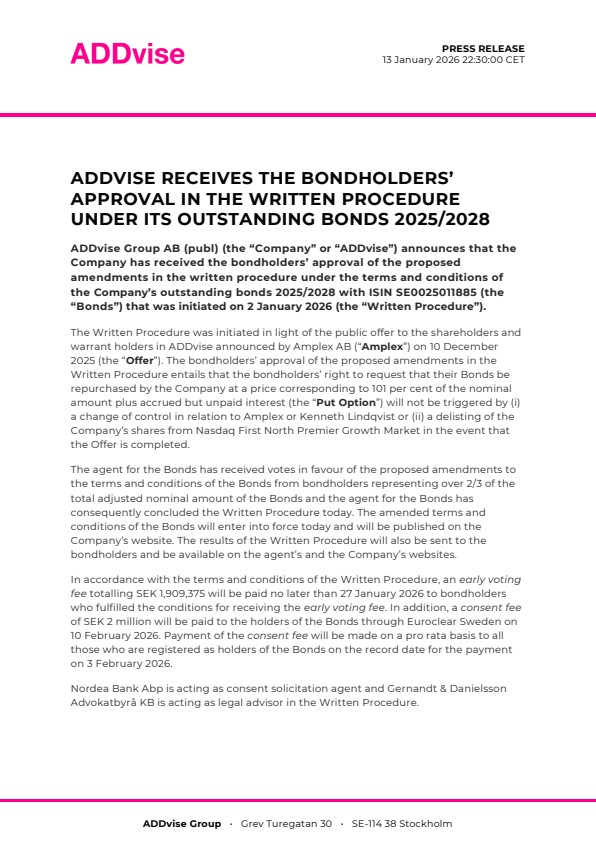 The Written Procedure was initiated in light of the public offer to the shareholders and warrant holders in ADDvise announced by Amplex AB (“Amplex”) on 10 December 2025 (the “Offer”). The bondholders’ approval of the proposed amendments in the Written Procedure entails that the bondholders’ right to request that their Bonds be repurchased by the Company at a price corresponding to 101 per cent of the nominal amount plus accrued but unpaid interest (the “Put Option”) will not be triggered by (i) a change of control in relation to Amplex or Kenneth Lindqvist or (ii) a delisting of the Company’s shares from Nasdaq First North Premier Growth Market in the event that the Offer is completed.