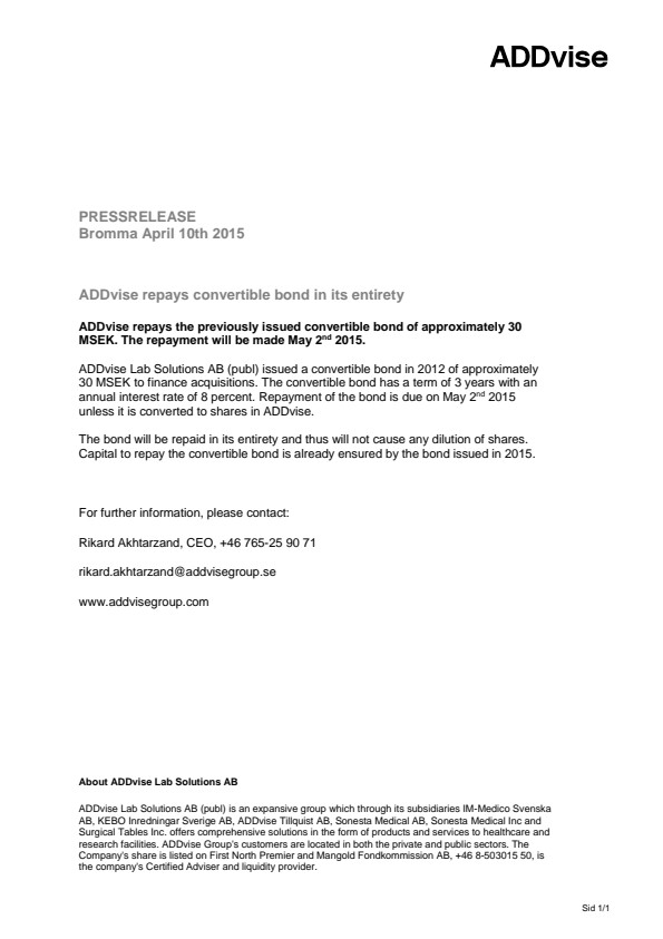 ADDvise Lab Solutions AB (publ) issued a convertible bond in 2012 of approximately 30 MSEK to finance acquisitions. The convertible bond has a term of 3 years with an annual interest rate of 8 percent. Repayment of the bond is due on May 2nd 2015 unless it is converted to shares in ADDvise.