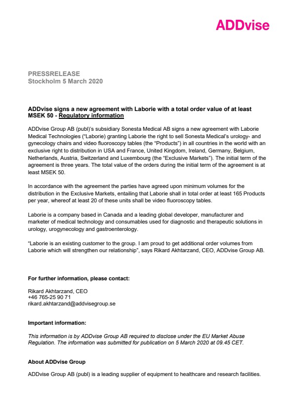 ADDvise Group AB (publ)’s subsidiary Sonesta Medical AB signs a new agreement with Laborie Medical Technologies (“Laborie) granting Laborie the right to sell Sonesta Medical’s urology- and gynecology chairs and video fluoroscopy tables (the “Products”) in all countries in the world with an exclusive right to distribution in USA and France, United Kingdom, Ireland, Germany, Belgium, Netherlands, Austria, Switzerland and Luxembourg (the “Exclusive Markets”). The initial term of the agreement is three years. The total value of the orders during the initial term of the agreement is at least MSEK 50.