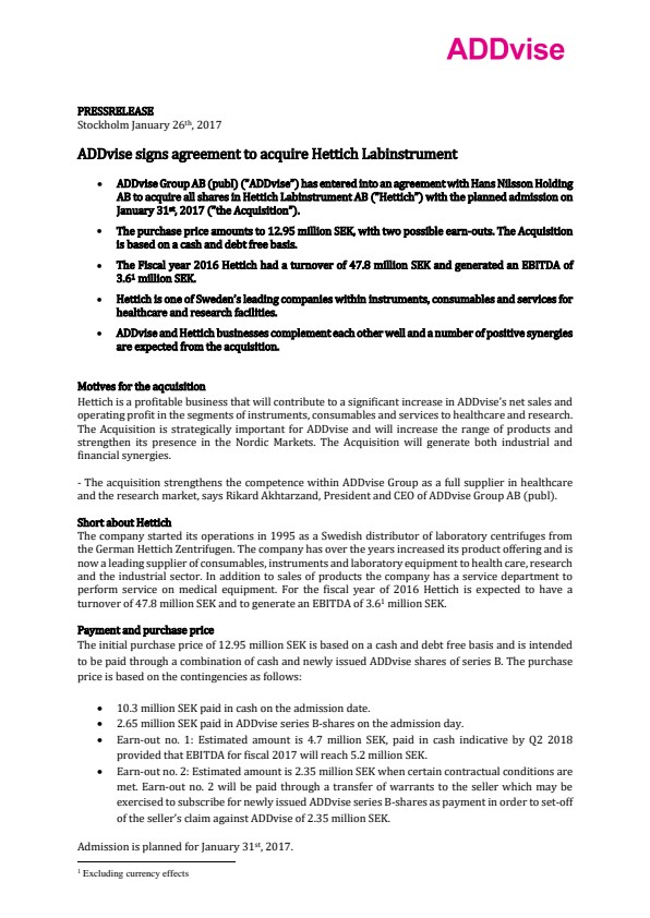 - ADDvise Group AB (publ) (”ADDvise”) has entered into an agreement with Hans Nilsson Holding AB to acquire all shares in Hettich Labinstrument AB (”Hettich”) with the planned admission on January 31st, 2017 (”the Acquisition”).