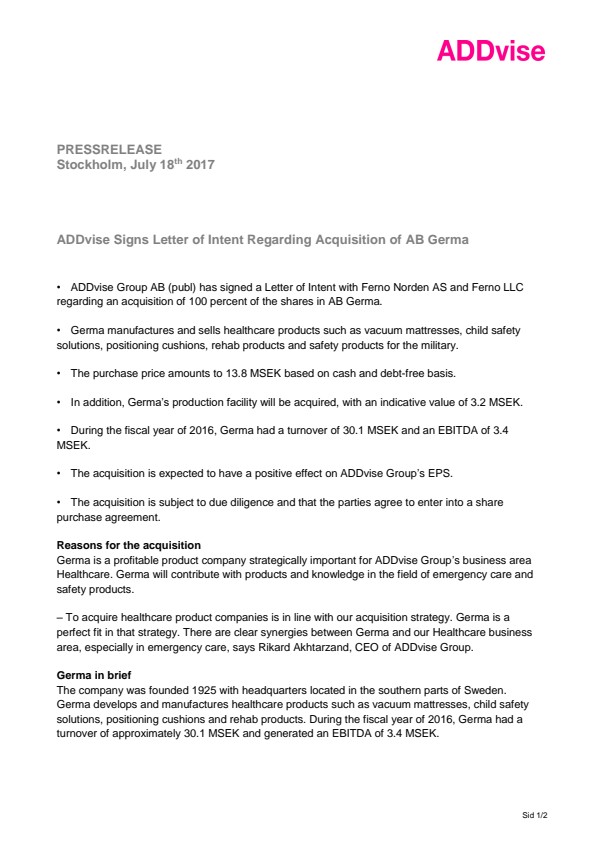 ADDvise Group AB (publ) has signed a Letter of Intent with Ferno Norden AS and Ferno LLC regarding an acquisition of 100 percent of the shares in AB Germa.