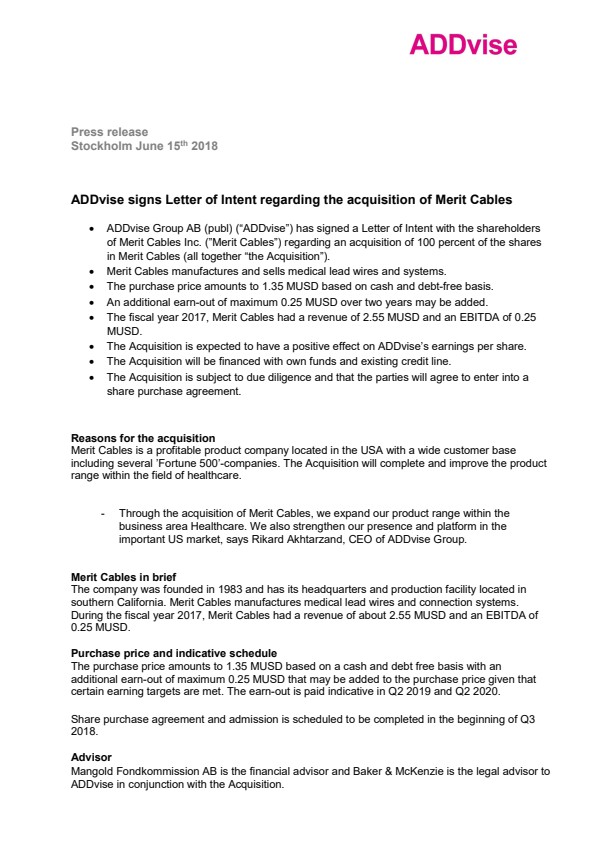 • ADDvise Group AB (publ) (“ADDvise”) has signed a Letter of Intent with the shareholders of Merit Cables Inc. (”Merit Cables”) regarding an acquisition of 100 percent of the shares in Merit Cables (all together “the Acquisition”).