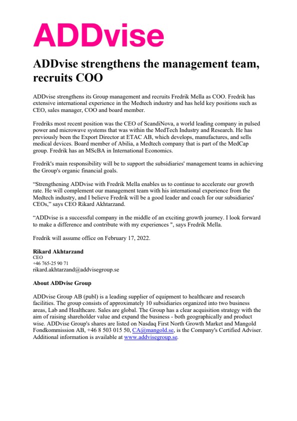 “Strengthening ADDvise with Fredrik Mella enables us to continue to accelerate our growth rate. He will complement our management team with his international experience from the Medtech industry, and I believe Fredrik will be a good leader and coach for our subsidiaries’ CEOs,” says CEO Rikard Akhtarzand.
