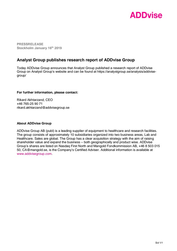 ADDvise Group AB (publ) is a leading supplier of equipment to healthcare and research facilities. The group consists of approximately 10 subsidiaries organized into two business areas, Lab and Healthcare. Sales are global. The Group has a clear acquisition strategy with the aim of raising shareholder value and expand the business – both geographically and product wise. ADDvise Group’s shares are listed on Nasdaq First North and Mangold Fondkommission AB, +46 8 503 015 50, CA@mangold.se, is the Company’s Certified Adviser. Additional information is available at www.addvisegroup.com.
