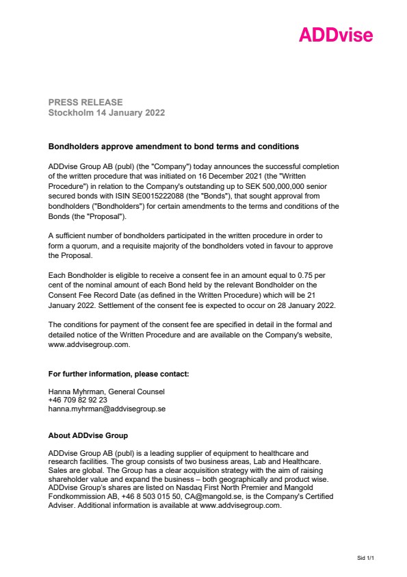 ADDvise Group AB (publ) (the “Company”) today announces the successful completion of the written procedure that was initiated on 16 December 2021 (the “Written Procedure”) in relation to the Company’s outstanding up to SEK 500,000,000 senior secured bonds with ISIN SE0015222088 (the “Bonds”), that sought approval from bondholders (“Bondholders”) for certain amendments to the terms and conditions of the Bonds (the “Proposal”).